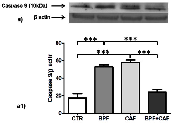 Caspase 9 expression in rat kidney. Western blotting of Caspase 9 active fragments cleaved (a) in the kidney extracts of CTR, BPF, CAF and BPF + CAF rats; (a1) shows the densitometric quantification of the blots. Protein loading was verified by using the anti-β actin antibody. Data are means ± SD of five determinations for each animal (n = 3). Statistical differences were evaluated by two-way ANOVA followed by Tukey’s multiple comparisons test (*** p < 0.0001).