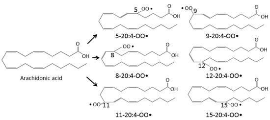 Hydrogen peroxide (H2O2) is produced from superoxide anion (O2•−) by superoxide dismutase (SOD) through a dismutation reaction. It is the least reactive molecule among ROS and is stable under physiological pH. The hydroxyl radical (•OH), the most reactive and hazardous radical, is formed from H2O2 in the presence of metal ions, and it has a very short in vivo half-life. The hydroxyl radical plays an important role in the reactions of lipid peroxidation. It oxidizes lipids containing carbon-carbon double bonds, especially polyunsaturated fatty acids (PUFAs). In PUFAs, the –C=C– units are separated by a single-bonded –C– atom. The hydrogen atoms attached to these –C– atoms (bis-allylic hydrogens) are susceptible to attack by hydroxyl radical. Therefore, PUFAs, such as arachidonic (20:4) and docosahexaenoic acid (22:6), are highly peroxidizable fatty acids. Arachidonic acid has a 20-carbon chain as a backbone and four cis-double bonds at the C5, C8, C11, and C14 positions and consequently three bis-allylic hydrogens (Figure 1). The abstraction of a bis-allylic hydrogen attached to a –C– atom at position 7 and the subsequent insertion of oxygen results in 5-20:4-OOH or 9-20:4-OOH. Similarly, the hydrogen abstraction at C10 and C13 generates 8-20:4-OO• or 12-20:4-OO• and 11-20:4-OO• or 15-20:4-OO•, respectively (Figure 2). Among these arachidonic acid peroxides, 8-, 9-, 11-, and 12-peroxy radicals show a tendency to generate their corresponding endoperoxides rather than hydroperoxides. For example, 11-peroxy radical (1) generates endoperoxide (4) [15,16] (Figure 3). The endoperoxides subsequently produce a broad range of reactive intermediates, such as F2-IsoPs and MDA.