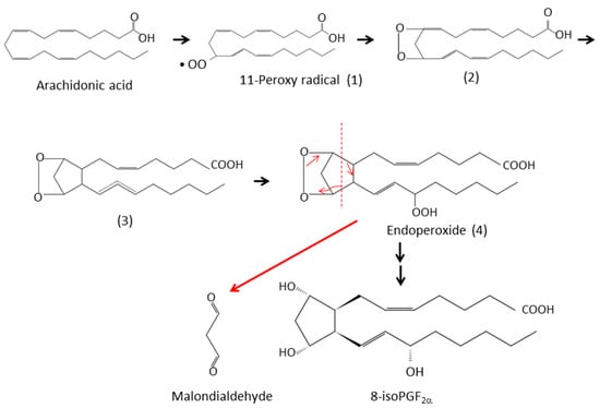 MDA is one of the most commonly used biomarkers for lipid peroxidation. Its plasma levels correlate closely with plasma 8-isoPGF2α levels [40]. This aldehyde is an end product of enzyme- and free radical-catalyzed peroxidation of a variety of PUFAs. The amount of MDA is far much more than that of 8-isoPGF2α at a molecular ratio level, that is, 500:1 [16,40].