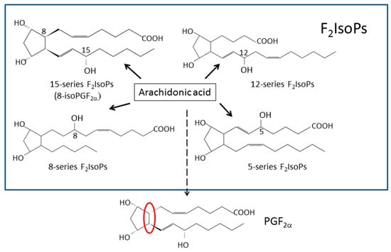 The isoprostanes (IsoPs) are bioactive prostaglandin-like compounds formed in vivo via a nonenzymatic mechanism involving the free radical-initiated peroxidation of arachidonic acid. A specific class of IsoPs, the F2-IsoPs, are measured as indices of endogenous oxidative stress. 8-, 9-, 11-, and 12-peroxy radicals of arachidonic acid are predicted to lead the generation of the four classes of F2-IsoPs, respectively (Figure 4, see also Figure 2 and Figure 3). Although various assays for individual IsoPs have been developed [22,23,24,25,26], 8-isoprostaglandin F2α (8-isoPGF2α, also known as 8-epi-PGF2α or 8-isoprostane) is the most commonly used biomarker for the assessment of oxidative stress. As depicted in Figure 4, 8-isoPGF2α has a different configuration at C8 chiral carbon, compared with PGF2α.