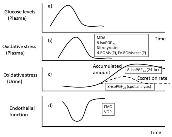 Time course of changes in plasma glucose, oxidative stress, and endothelial function. (a) Plasma glucose levels increase after a meal and then return to the baseline. (b) Changes in oxidative stress can be assessed by periodic measurement of plasma levels of malondialdehyde (MDA), 8-isoPGF2α, or nitrotyrosine after a meal. These markers of oxidative stress increase and return to baseline in a time course manner similar to the changes in plasma glucose level. (c) Plasma 8-isoPGF2α is gradually excreted into urine. Therefore, the excretion rate is expected to increase and thereafter decline, whereas accumulated urinary 8-isoPGF2α reaches a maximum. (d) Endothelial function is assessed by venous occlusion plethysmography (VOP) and flow-mediated dilatation (FMD) (FMD and VOP will be explained later in the text). Endothelial function is impaired concomitantly with the increase in plasma glucose levels and oxidative stress.