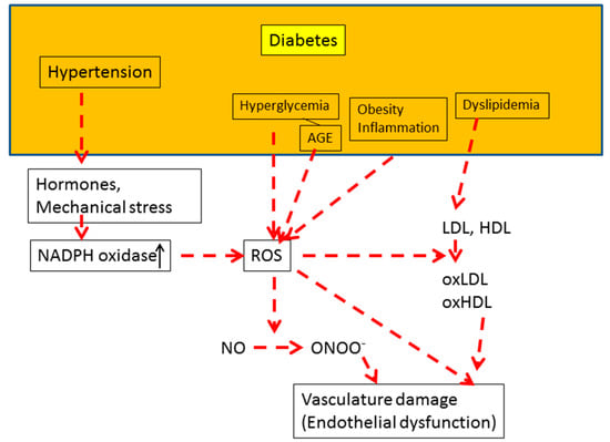 Reactive oxygen species (ROS) are major players in the development of vascular endothelial dysfunction in diabetes. Diabetes mellitus is associated with hyperglycemia, hypertension, obesity, inflammation, and dyslipidemia, all of which lead to vascular damage via ROS-mediated reactions. Details of the ROS-mediated reactions are described in the text (Section 5.3, Section 5.4 and Section 5.5).