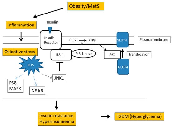 The exact mechanism for the role of oxidative stress in vascular damage and development of diabetes-associated complications is complex. Obesity-associated inflammation causes insulin resistance through several mechanisms (Figure 7) [87]. Increased oxidative stress is one of the risk factors for insulin resistance. Stimulation of the insulin receptor signaling pathway increases cellular uptake of glucose from the blood stream through glucose transporter 4 (GLUT4) translocation to the plasma membrane of skeletal muscle cells and adipocytes. On the other hand, increased ROS levels cause activation of the c-Jun N-terminal kinase (JNK) pathway, thereby leading to increased phosphorylation of serine residue of IRS-1, which no longer functions towards PI3K protein [88]. Therefore, ROS generation impairs GLUT4 translocation and increases intravascular glucose levels. ROS has also been reported to inhibit insulin signal transduction by activation of PKC and nuclear factor kappa B (NF-κB) [88,89]. There is thus a cause-effect relationship between the development of diabetes and oxidative stress.