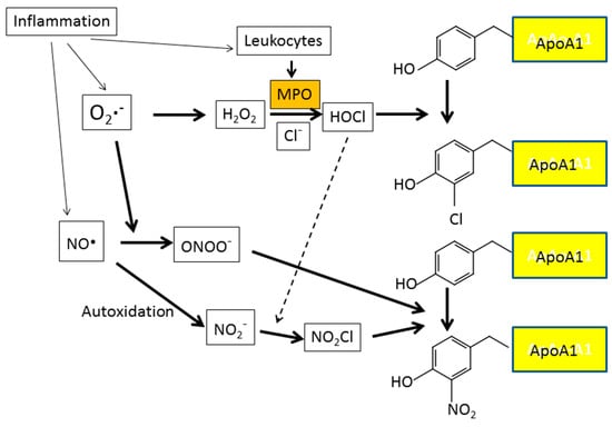 Oxidative modification of HDL alters its functions. Oxidation of HDL can be measured by various techniques, one of which is determination of NO2Tyr and ClTyr contents in ApoA1. Apo A1 is a primary protein component of HDL and selective target for myeloperoxide (MPO)-catalyzed oxidation (Figure 8). In the study of Zheng et al. [121], HDL was immunoprecipitated from serum and the contents of apoA-I NO2Tyr and ClTyr were measured by stable isotope dilution tandem MS. Their results demonstrated impairment of ABCA1-dependent cholesterol efflux from cholesterol-laden macrophages with increased content of apoA-I NO2Tyr and ClTyr, suggesting that the oxidative processes catalyzed by MPO participate in the development of “dysfunctional” forms of HDL. MPO-mediated carbamylation of HDL-associated ApoA1 may also render HDL dysfunctional [122]. The carbamyllysine content of lesion-derived HDL was more than 20-fold higher in comparison with ClTyr levels. Because one carbamyllysine residue per apo A-I is sufficient to induce cholesterol accumulation in macrophages, HDL carbamylation is likely to contribute to foam cell formation in atherosclerotic lesions. Thus, tests of HDL function, such as the measurement of HDL-receptor-mediated cholesterol efflux, may be a better predictor of cardiovascular risk than HDL-cholesterol levels.
