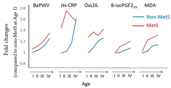 - Kim, M.; Kim, M.; Yoo, H.J.; Lee, S.Y.; Lee, S.H.; Lee, J.H. Age-specific determinants of pulse wave velocity among metabolic syndrome components, inflammatory markers, and oxidative stress. J. Atheroscler. Thromb. 2018, 25, 178–185. [Google Scholar] [CrossRef]