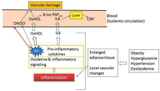 Obesity increases the odds of developing many common diabetic complications, including heart disease, retinopathy, dyslipidemia, and hypertension [132]. Weight gain and excess nutrition increase adipose tissue mass and adipocyte size, resulting in damage of adipocytes, initiation of inflammatory processes, and recruitment of macrophages into the adipose tissue [133]. These changes stimulate the entry of pro-inflammatory cytokines, adipokines, and fatty acids into the systemic circulation and the triggering of oxidative stress. The visceral adipose tissue microenvironment was reported to be toxic to the vasculature, with up-regulation of pro-inflammatory and oxidative-stress related mediators that cause severe impairment of arteriolar endothelial vasodilator function [134].