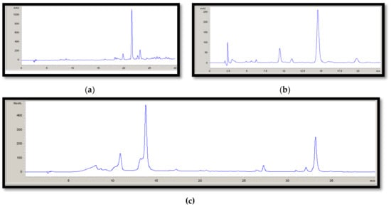 The total phenolic content (TPC) was determined quantitatively using the Folin–Ciocalteu reagent and gallic acid as the standard [19,20]. Each extract was diluted with water or ethanol, according to its polarity, in a 1000 ppm solution. Then, 2 mL of 2% Na2CO3 was added to 100 µL of sample and a standard solution of gallic acid. After, 100 µL of 10:1 Folin–Ciocalteau phenol reagent was added. Following incubation for 30 min, the absorbance was measured at 750 nm. The TPC was expressed as mg gallic acid equivalents (GAE) per g extract.