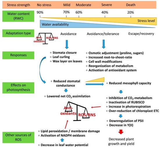 Drought stress severely impacts plant development, growth and fertility. Drought triggers water loss and a decrease in water potential, which concomitantly leads to a reduction in cell turgor (Figure 1). Among the fastest processes induced by drought is the abscisic acid (ABA)-mediated closure of stomata []. Prolonged drought stress and increased stress intensity lead to further acclimation reactions. These responses include osmotic adjustment [,], decreased shoot-root ratio [], cell wall modifications [,], reprogramming of metabolism [], and activation of the antioxidant system [,]. Many of these modifications are measurable and are used to characterize the severity of drought stress. Measurable traits are, for example, the stomatal and mesophyll conductance, net photosynthesis, photorespiration, abundance of osmoprotectants, tissue water potential, ABA content and membrane integrity. Drought avoidance includes morphological adaptations, like leaf curling and increased wax deposition on the leaf surface [] (Figure 1).