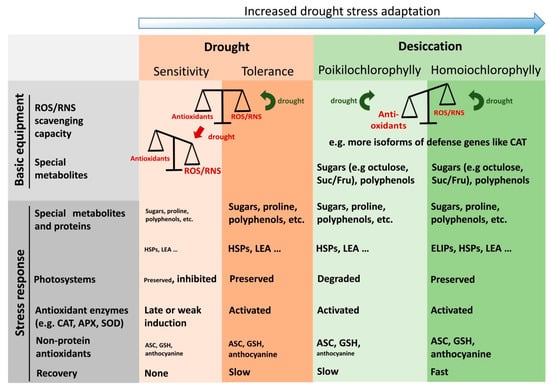 Characteristic features of drought-sensitive, drought-tolerant and desiccation-tolerant plants. The figure summarizes properties related to metabolism, antioxidant defense, and recovery which often are associated with the physiological traits. Red arrow: reactive oxygen species (ROS)/reactive nitrogen species (RNS) gain prevalence; green arrow: status is preserved following drought. Fond size correlates with the strength of stress responses measured. ROS, reactive oxygen species; RNS, reactive nitrogen species; HSP, heat shock protein; LEA, late embryogenesis abundant protein; ELIP, early light-inducible protein; Suc/Fru, sucrose to fructose ratio; CAT, catalase; APX, ascorbate peroxidase; SOD, superoxide dismutase; ASC, ascorbate; GSH, glutathione.