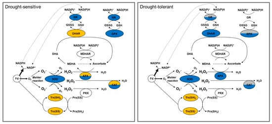 Changes in the activation of the antioxidative system in sensitive and tolerant species. Orange, downregulation, blue, upregulation, grey, no significant changes, no color, no data. APX, ascorbate peroxidase; CAT, catalase; DHAR, dehydroascorbate reductase; Fd, ferredoxin; GPX, glutathione peroxidase; GR, glutathione reductase; MDHAR, monodehydroascorbate reductase; PRX, peroxiredoxin; SOD, superoxide dismutase; TRX, thioredoxin.