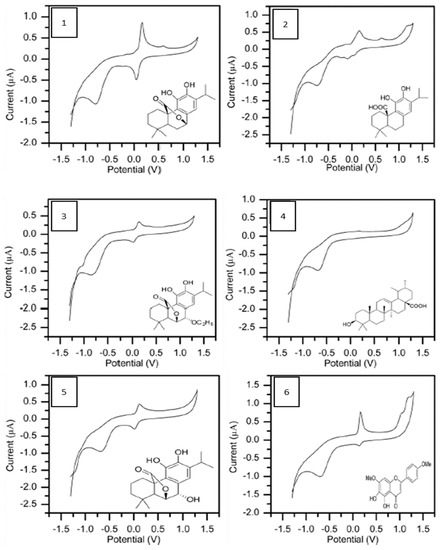 Cyclic voltammograms of isolated compounds. The voltammograms were recorded at 50 mV/s (from −1300 to 1300 mV) for 1 mg/L of each compound in phosphate buffer (pH 6.5).