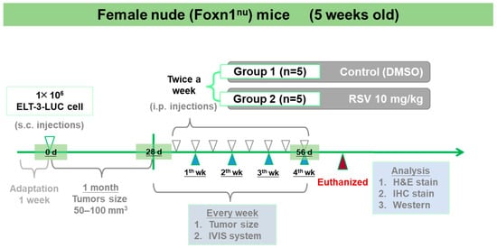 Five-week-old female nude (Foxn1nu) mice (BioLASCO, Taipei, Taiwan) were housed under a 12 h light/12 h dark cycle in a pathogen-free environment, with ad libitum access to food and water. Tumors were implanted through the subcutaneous (s.c.) injection of ELT-3-LUC cells (1 × 106 cells suspended in 0.1 mL phosphate-buffered saline (PBS)/Matrigel solution for each mouse) into the right flank of the mice. After the tumors reached a size of 50–100 mm3 (approximately 1 month), the mice were randomly assigned to two groups (n = 5): one group received an intraperitoneal (i.p.) injection of RSV (10 mg·kg−1; treatment group), and the other group received a vehicle (DMSO; control group) twice a week for 4 weeks. The tumor volume was measured using calipers and calculated as L × W2 × 0.52, where L is the length and W is the width. The tumor volumes and body weights were recorded until the animals were sacrificed by an i.p. injection of anesthetic mixtures [1 mL zoletil (Virbac, Carros, France) + 1 mL rompun (Bayer, Pittsburgh, PA, USA)]. Every week, the mice were administered an i.p. injection of luciferin (150 mg·kg−1 body weight) and detected using a non-invasive in vivo imaging system (IVIS). At the end of the experiment, the tumor tissues were stained with hematoxylin and eosin (H&E). All the animal studies were conducted according to the protocols approved by the Institutional Animal Care and Use Committee (IACUC) of Taipei Medical University (IACUC approval no. 2015–0115).
