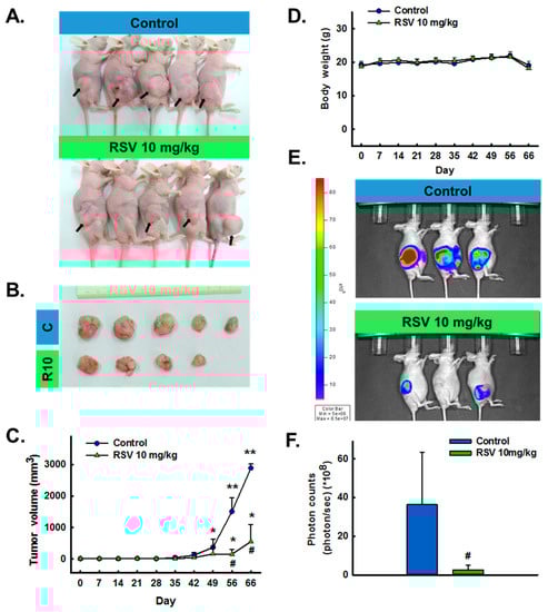 Effect of resveratrol (RSV) on tumor xenograft growth. (A) Morphology and (B) size of tumors isolated from the sacrificed mice in each group are shown at day 66, the end-point of the treatment. (C) Tumor volumes and (D) body weights of nude (Foxn1nu) mice. (E) Total photon flux from imaging on day 56 after xenografting. (F) All luciferase images were normalized to the same photon saturation scale. Data are presented as the mean ± SD (n = 5 or 3); * p < 0.05 and ** p < 0.001 vs. day 0; # p < 0.05 vs. control.