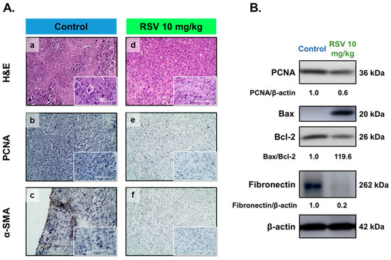 To explore the effects of RSV further, immunohistochemical analyses were performed. Compared with the control group, the RSV-treated (10 mg·kg−1) group showed a decrease in the proportions of cells that were positive for PCNA (a marker of cell growth, Figure 3A-b,-e) or α-SMA (a smooth muscle marker, Figure 3A-c,-f), as well as hematoxylin and eosin staining (H&E, Figure 3A-a,-d). In addition, Western blot analysis showed that mice treated with RSV showed reduced levels of PCNA and fibronectin in whole tissue extracts (Figure 3B), but enhanced levels of Bax/Bcl-2 (apoptosis-related markers).