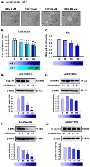 Cytotoxic effects of resveratrol (RSV) on primary human leiomyoma cells. Leiomyoma cells were exposed to either vehicle (dimethyl sulfoxide; DMSO) or RSV (10–100 μM) for 48 h or 72 h. (A) Morphology of leiomyoma cells after the indicated treatment (magnification, ×200). (B) Cell proliferation was measured using a 3-(4,5-dimethylthiazol-2-yl)-2,5-diphenyltetrazolium bromide (MTT) assay. (C) RNA samples were isolated from leiomyoma cells treated with RSV (0–100 μM) and subjected to quantitative reverse transcription–polymerase chain reaction (qRT–PCR) using primers specific for fibronectin (FN1). (D–G) Leiomyoma cell lysates were separated using sodium dodecyl sulfate polyacrylamide gel electrophoresis (SDS–PAGE) and analyzed using Western blot with anti-COL1A1, vimentin, α-SMA, and β-catenin. β-actin was used as a loading control. The values of the band intensity represent the densitometric estimation of each band normalized to β-actin. Protein quantification of COL1A1, vimentin, α-SMA, and β-catenin expression in leiomyoma cells is shown in the bar graph. The results are expressed as the means ± SD of three independent experiments; * p < 0.05, ** p < 0.001, as compared with the control.