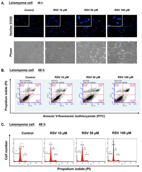 The induction of apoptosis was determined using Annexin V-FITC/PI staining. The leiomyoma cells were seeded in 10 cm2 culture dishes (1 × 106 cells) and treated with RSV (10, 50, 100 μM) for 48 h. The cells were stained with Annexin V-FITC and PI by incubation for 15 min at room temperature protected from light. The apoptotic cells were analyzed using BD Accuri™ C6 Plus Flow Cytometer (BD Biosciences, San Jose, CA, USA), and the results were analyzed using the BD Accuri™ C6 Plus software (BD Biosciences, San Jose, CA, USA).