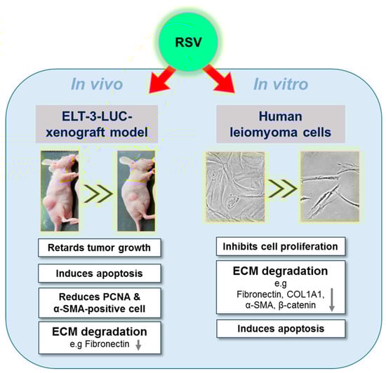 The present study demonstrated that RSV suppressed tumor growth in vivo and inhibited primary human leiomyoma cells in vitro (Figure 6). In addition, RSV regulated ECM-associated protein expression. These findings indicate that RSV has the potential to reduce hyperplasia of leiomyoma cells. To the best of our knowledge, this is the first study to demonstrate the inhibitory potential of RSV on UF growth in vivo and may encourage further studies to highlight the molecular mechanisms involved in RSV and UF.