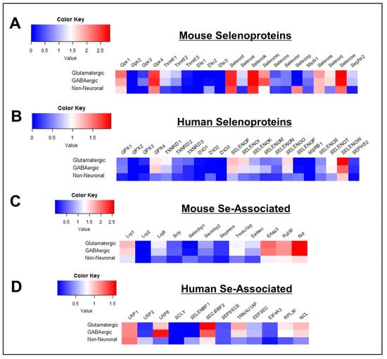 General profile of Se-Related Transcriptome in Cortical Cells. (A,B) Heatmaps detailing expression of mouse (A) and human (B) selenoprotein genes in glutamatergic, GABAergic, and non-neuronal cells. (C,D) Corresponding heatmaps of mouse (C) and human (D) Se-associated genes.