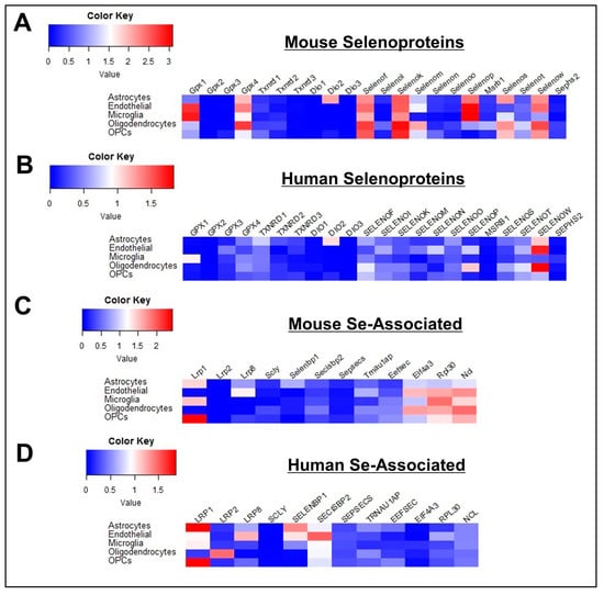 Profile of Se-Related Transcriptome in Non-Neuronal Cells. (A,B) Heatmaps detailing expression of mouse (A) and human (B) selenoprotein genes in astrocytes, endothelial cells, microglia, oligodendrocytes, oligodendrocyte precursor cells (OPCs). (C,D) Corresponding heatmaps of mouse (C) and human (D) Se-associated genes.