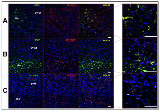 Astrocytes co-express selenoprotein P (SELENOP) and selenium binding protein 1 (SELENBP1). (A) Confocal images showing expression of GFAP (left), SELENOP (middle left), and merged images at low (middle right) and high magnification (right). (B) Images of GFAP (left), SELENBP1 (middle left), and merged images at low (middle right) and high magnification (right). (C) Images of SELENBP1 (left), SELENOP (middle left), and merged images at low (middle right) and high magnification (right). Abbreviations: dhc: dorsal hippocampal commisure; pVIS1: primary visual cortex. Scale bar = 50 μm.