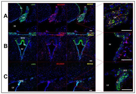 To further investigate SELENOP expression, we performed immunohistochemistry on mouse brain sections. SELENOP expression largely overlapped with that of GFAP+ astrocytes and was generally more prominent in white matter. For instance, we observed minimal SELENOP immunoreactivity in the mouse primary visual cortex, whereas levels were much more apparent in the adjacent dorsal hippocampal commissure (Figure 3A). We also performed immunohistochemistry in parallel for the selenium binding protein 1 (SELENBP1), a relatively uncharacterized protein that binds selenite [22,23] and is thought to modulate Se metabolism and redox status [24]. In accord with the RNAseq single-cell data, SELENBP1 expression was predominantly localized to astrocytes (Figure 3B) and was co-expressed with SELENOP (Figure 3C). We also found that SELENOP expression was most robust in the choroid plexus and regions lining the brain ventricles. Double-label immunofluorescence revealed extensive, but not complete, overlap of SELENOP with LRP8 in the choroid plexus (Figure 4A) and along the ventricular walls (Figure 4B,C). LRP8 was particularly abundant in ependymal cells, while SELENOP appeared to be largely expressed in adjacent astrocytes with endfeet projecting toward the ventricular lining.