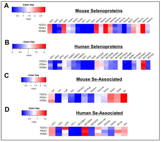 Profile of Se-Related Transcriptome in Glutamatergic Neurons. (A,B) Heatmaps detailing expression of mouse (A) and human (B) selenoprotein genes in FEZF2+, PENK+, and RORB+ glutamatergic neurons. (C,D) Corresponding heatmaps of mouse (C) and human (D) Se-associated genes.