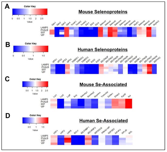 Profile of Se-related transcriptome in GABAergic neurons. (A,B) Heatmaps detailing expression of mouse (A) and human (B) selenoprotein genes in LAMP5+, PVALB+, SST+, and VIP+ GABAergic neurons. (C,D) Corresponding heatmaps of mouse (C) and human (D) Se-associated genes.