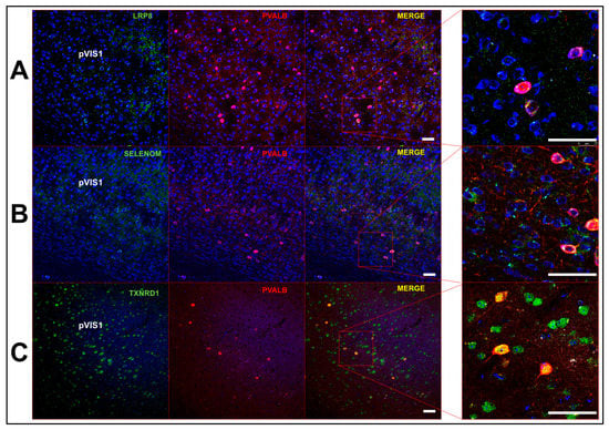 Expression of Se-related proteins in parvalbumin-expressing interneurons (PVIs). (A) Confocal images showing expression of LRP8 (left), parvalbumin, (PVALB, middle right) and merged images at low (middle right) and high magnification (right) in the mouse primary visual cortex. (B,C) Images depicting expression of SELENOM (B) and thioredoxin reductases (TXNRD) (C) relative to PVALB. Scale bar = 50 μm.