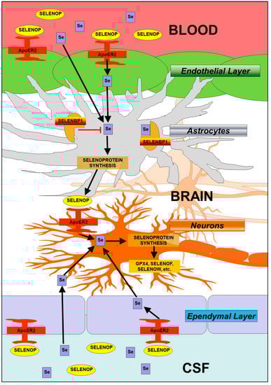 Hypothetical model of Se homeostasis in brain. Circulating SELENOP present in blood and cerebrospinal fluid (CSF) is taken up by LRP8-positive cells in the epithelial (blood–brain barrier) and ependymal (brain–CSF barrier) layers, resynthesized in neighboring astrocytes, and released to supply LRP8-positive neurons with Se. Within astrocytes, SELENBP1 may sequester Se away from selenoprotein synthesis and thereby negatively regulate SELENOP synthesis. Evidence also indicates the existence of parallel, non-SELENOP pathway by which a small molecule form of Se enters the brain.