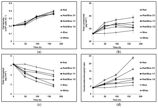 (a) Cell growth; (b) Cellular content of total carotenoids; (c) cellular content of total chlorophyll; (d) Carotenoids/Chlorophyll ratio in D. salina CCAP 19/41 grown under different ratios of red and blue light (Red/Blue 1/0, 2/1, 1/1, 1/2, 0/1) or white light with a total light intensity of 1000 μmol photons m−2 s−1 after dark-acclimation. Each culture condition was set up at least in triplicate.
