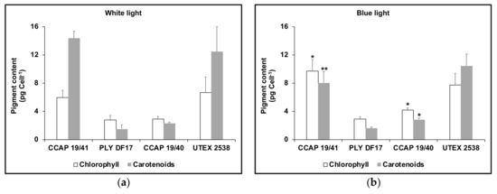 Cellular content of total carotenoids and of total chlorophyll for different D. salina strains cultivated each to the mid log phase under either white (a) or blue (b) light with a total light intensity of 1000 μmol photons m−2 s−1 after dark-acclimation. Each culture condition was set up at least in triplicate. Results were analysed by one way ANOVA comparing blue light to white light, **: 0.001 < p ≤ 0.01; *: 0.01 < p ≤ 0.05.