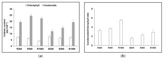 Cellular content of total carotenoids and total chlorophyll (a) and carotenoids/chlorophyll ratio (b) in D. salina CCAP19/41 grown under continuous red (R200; R500; R1000) or blue (B200; B500; B1000) LED light at three different light intensities of 200, 500 and 1000 µmol m−2 s−1 for 48 h. Each culture condition was set up at least in triplicate.