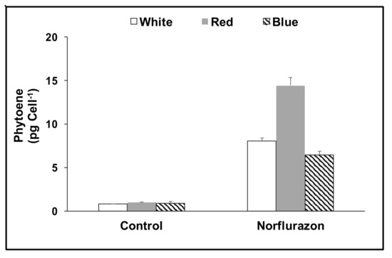 Cellular content of phytoene in cultures treated with no inhibitors (control) or with 5 µM norflurazon. Cultures were maintained under red, blue and white LED light at 200 µmol m−2 s−1 for 48 h.
