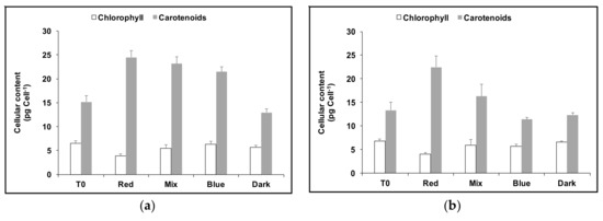 Cellular content of total carotenoids and chlorophyll under continuous blue (a) or red (b) LED light at 1000 µmol m−2 s−1 for 24 h followed by 24 h growth under either red light, a mix of 1:1 red and blue light, blue light at the same light intensity of 1000 µmol m−2 s−1 or dark. Each culture condition was set up at least in triplicate. T0: time point after growth for 24h only, in either blue (a) or red (b) light at 1000 µmol m−2 s−1.