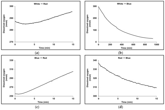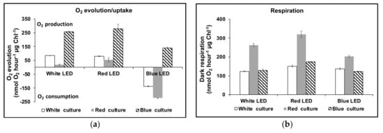 Dark-adapted cultures were cultivated in red, blue or white light at 1000 µmol m−2 s−1 for 48 h before measuring the rates of oxygen evolution/uptake over a 20 min period with illumination supplied once more by white, red or blue LED lights at 1000 µmol m−2 s−1 (Figure 7a). Dark respiration was also recorded (Figure 7b). The rate profiles of oxygen uptake/evolution are shown in Figure 8. Red LED supported net oxygen evolution (55 ± 15 nmol O2 h−1 μg chlorophyll−1) but on transfer to blue light in the Clark-type electrode, photo-oxidation massively exceeded the rate of oxygen evolution and oxygen was consumed at an exponentially increasing rate (Figure 7a; 222 ± 32 nmol O2 h−1 μg chlorophyll−1). Significantly cultures grown in red LED also supported the highest rate of dark respiration (320 ± 17 nmol O2 h−1 μg chlorophyll−1, ~2.6-fold greater than that for cultures maintained in either blue or white LED light), but this also declined when cultures were transferred to blue light in the Clark-type electrode. By contrast, cultures maintained in blue LED supported ~3-fold higher rate of net oxygen evolution (141 nmol O2 h−1 μg chlorophyll−1) in the Clark-type electrode in blue light, compared to those in maintained in red LED. On transfer of blue light cultures to red light in the Clark-type electrode, the rate of oxygen evolution doubled to 280 nmol O2 h-1 μg chlorophyll−1 (Figure 7b), and was maintained at a linear rate during the period of measurement. The rate of dark respiration also increased slightly from 123 ± 2.7 nmol O2 h−1 μg chlorophyll−1 to 175 ± 5.0 nmol O2 h−1 μg chlorophyll−1.