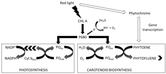The coupling of reduction of the plastoquinone pool to carotenoid synthesis driven by chlorophyll absorption of red light may involve the red light photoreceptor phytochrome. Photosynthetic organisms are known to perceive red light signals via phytochrome. The synthesis of phytoene by phytoene synthase is under phytochrome regulation [37,38,39] and is upregulated by both red and far-red light [37]. Red light also lowers the concentration of the transcription factor PIF1, a repressor of carotenoid biosynthesis [40]. In those strains which do not accumulate carotenoids, alternative mechanisms may serve to consume energy e.g., via NAD(P)H reduction of dihydroxyacetone phosphate to form glycerol [41].