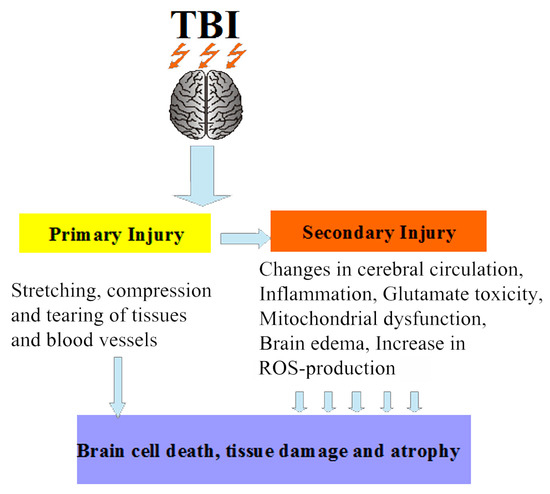 Schematic representation of traumatic brain injury (TBI): the secondary damage involves many complex biochemical and cellular processes that increase the severity of the primary damage. ROS: reactive oxygen species.