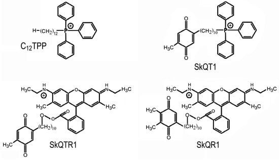 Structure of SkQR1, 10-(6′-plastoquinonyl)decylrhodamine 19; SkQT1, (a mixture of 10-(6′-toluquinonyl)decyltriphenylphosphonium and 10-(5′-toluquinonyl)decyltriphenylphosphonium in the proportion of 1.4:1); SkQTR1, 10-(6′-toluquinonyl)decylrhodamine 19; C12TPP, dodecyltriphenylphosphonium.