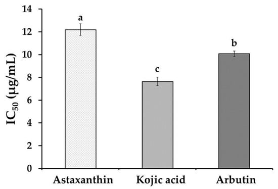 Tyrosinase inhibition activity of astaxanthin extract, kojic acid, and arbutin. Values are expressed as 50% inhibitory concentration (IC50). Letters with different superscripts indicate samples that are significantly different (p < 0.05) from each other.