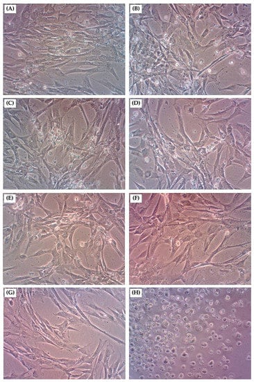 Morphological changes of human dermal fibroblast cells after exposure to astaxanthin extract for 24 h (magnification ×10). (A) Control cells, (B) cells treated with 5 µg/mL astaxanthin, (C) 10 µg/mL astaxanthin, (D) 20 µg/mL astaxanthin, (E) 40 µg/mL astaxanthin, (F) 80 µg/mL astaxanthin, (G) 160 µg/mL astaxanthin, and (H) cells treated with 100 µg/mL ascorbic acid (positive control).