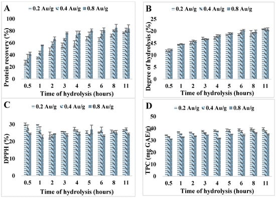 Reaction optimization of antioxidant kafirin Alcalase hydrolysates prepared at combined hydrolysis time of 0.5 to 11 h and enzyme-to-substrate ratios of 0.2, 0.4, and 0.8 Au/g. (A). Total protein recovery (%); (B). degree of hydrolysis; (C). DPPH scavenging activity (%) at 5 mg/mL; (D). total phenolic content (mg GAE/g).