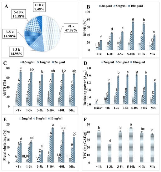 Ultrafiltration of kafirin Alcalase hydrolysates prepared at enzyme-to-substrate ratio of 0.4 Au/g and hydrolyzed for 4 h followed with MWCO membrane filtration at 10 k, 5 k, 3 k, and 1 kDa. (A). Weight distribution; (B). DPPH scavenging activity (%); (C). ABTS scavenging activity (%); (D). Reducing power capacity (Abs at 700 nm); (E). Metal chelating capacity (%); (F). Total phenolic content (mg GAE/g). * Blank represents the absorbance of reaction mixture at 700 nm using distilled water in substitute of sample. Different lowercase letters, capital letters, and roman numerals indicated significant difference at p < 0.05.