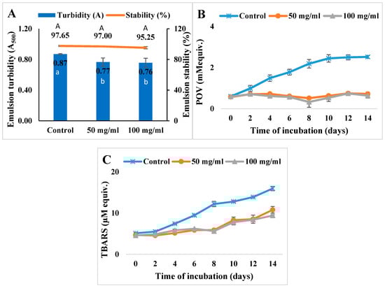 Inhibition effects of kafirin Alcalase 5–10 kDa hydrolysates prepared at enzyme-to-substrate ratio of 0.4 Au/g and hydrolyzed for 4 h in an oil-in-water emulsion model system incorporated at 50 and 100 mg/mL oil. (A). Emulsion turbidity (Abs at 500 nm) and stability (%); (B). POV (mM cumene hydroperoxide equivalent); (C). TBARS (µM tetramethoxypropan equivalent). Different lowercase and capital letters indicated significant difference at p < 0.05.