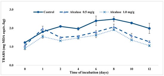 Selected fraction of kafirin hydrolysates with promising antioxidant activities was further evaluated for their performance against lipid peroxidation in a ground pork model system according to a described procedure []. Ground pork containing two different concentrations of antioxidant peptides were prepared, i.e., 0.5 and 1.0 mg hydrolysate per gram of meat, respectively. Sample containing no antioxidant was also prepared similarly for comparison. The prepared samples were stored at 4 °C refrigerator for different periods (i.e., 0, 1, 2, 4, 6, 8, 10, and 12 days), and the extent of lipid peroxidation was quantified by measuring the TBARS [].