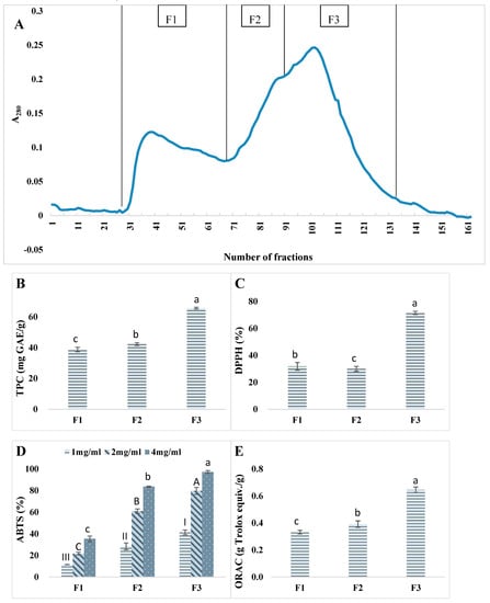 Gel filtration chromatography of kafirin Alcalase 5–10 kDa hydrolysates prepared at enzyme-to-substrate ratio of 0.4 Au/g and hydrolyzed for 4 h on a Sephadex G-25 column (26 mm × 850 mm). (A). Gel filtration chromatogram (Abs at 280 nm); (B). Total phenolic content (mg GAE/g); (C). DPPH scavenging activity (%) at 5 mg/mL; (D). ABTS scavenging activity (%); (E). ORAC (g Trolox equivalent/g). Different lowercase and capital letters indicated significant difference at p < 0.05.