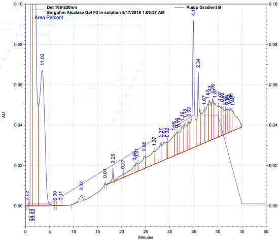 RP-HPLC chromatogram of Fraction 3 from gel filtration of 5–10 kDa kafirin Alcalase hydrolysates prepared at enzyme-to-substrate ratio of 0.4 Au/g and hydrolyzed for 4 h.