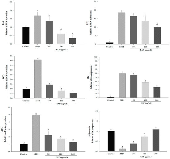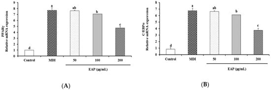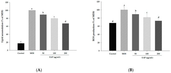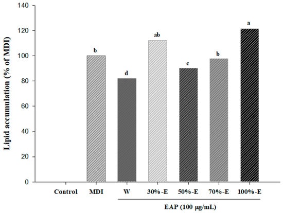3T3-L1 cells were purchased from the ATCC. Cells were seeded into 24-well plates and were cultured in DMEM containing 10% BCS and 1% P/S at 37 °C with 5% CO2. Two days after complete confluence was reached (D0), cells were cultured in MDI differentiation medium (DMEM containing 0.5 mM/L IBMX, 1 μM/L dexamethasone, and 10 μg/mL insulin), 1% PS, and 10% FBS for three days (D3). To evaluate the effects of EAP extract on adipocyte differentiation of 3T3-L1 preadipocytes, cells were cultured in MDI in the presence of various concentrations of EAP extract. Cells were then maintained in regular medium containing 1% PS, 10% FBS, and 10 μg/mL insulin (D5). After five days of induction, the medium was changed to DMEM containing 1% PS and 10% FBS (D7). On day seven, cells were harvested for further experiment.