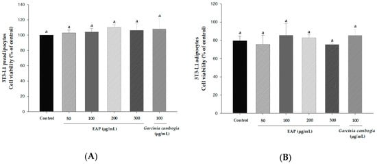 Effects of EAP water extract on cell viability of 3T3-L1 preadipocytes (A) and adipocytes (B). 3T3-L1 cells were treated with EAP water extract at various concentrations (50, 100, 200, and 300 μg/mL) for 24 h (A) and seven days (B). Cell viability was measured by WST-1 assay. Values are presented as mean ± standard deviation. Differences between means were considered statistically significant at p < 0.05.