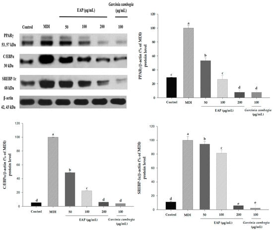 We evaluated the effect of EAP water extract on mRNA and protein expression of adipogenic target gene during adipogenesis of 3T3-L1 cells using real-time RT-PCR and western blot. Our results revealed that EAP water extract at a concentration of 200 μg/mL significantly downregulated the mRNA expression of PPARγ and C/EBPα (Figure 4). Moreover, EAP dose-dependently suppressed protein levels of PPARγ, C/EBPα and SREBP-1c in 3T3-L1 cell parallel with mRNA expression of PPARγ and C/EBPα gene. Garcinia cambogia at a concentration of 100 μg/mL, used as the positive control, decreased protein levels of PPARγ, C/EBPα and SREBP-1c in 3T3-L1 cell (Figure 5). These results indicate that EAP water extract exerts the anti-adipogenic effect by blocking PPARγ and CEBPα expression, which might have implications in anti-obesity effects.