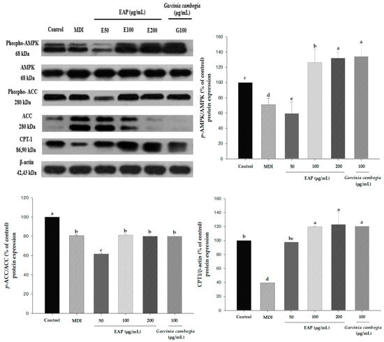 To elucidate how EAP water extract inhibited lipid accumulation and ROS production during the adipocyte differentiation, AMPK phosphorylated protein level and ACC were measured. We determined whether EAP (200 μg/mL) controlled the differentiation of adipocytes and vitality metabolism via the AMPK pathway in 3T3-L1 cells. The results show that EAP enhances AMPK phosphorylation and ACC in MDI-induced adipocyte differentiation. In addition, EAP upregulated CPT1 protein level (Figure 7). Garcinia cambogia also upregulated both phosphorylation AMPK and ACC as well as CPT1 protein levels in 3T3-L1 cells. These results indicated that EAP water extract may inhibit adipogenesis and lipogenesis via an activating AMPK signaling pathway.